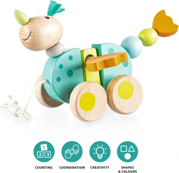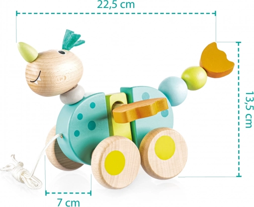 Tato dřevěná tahací hračka ve tvaru dráčka je skvělým společníkem pro malé objevitele. Při chůzi se díky jednoduchému mechanismu třepotají křídla i ocásek, což děti baví a podporuje je v přirozeném pohybu. Odolná kolečka umožní hravé ježdění doma i venku.