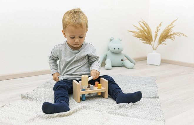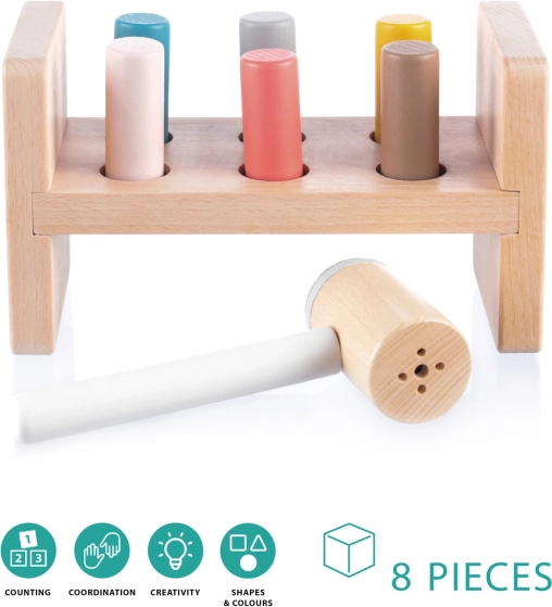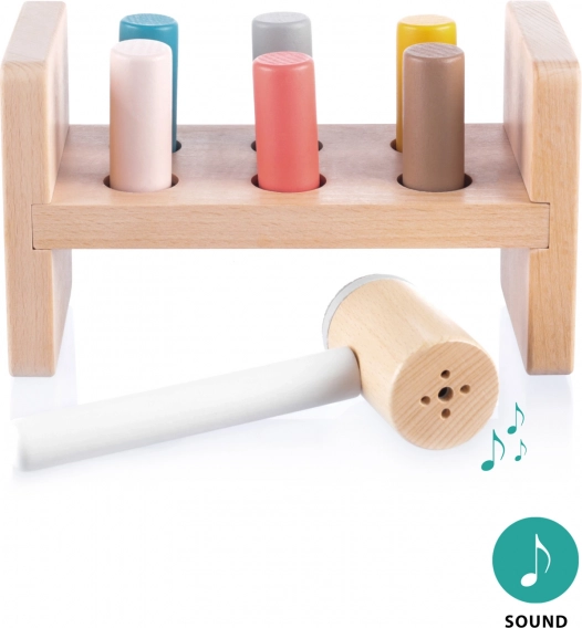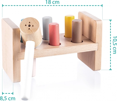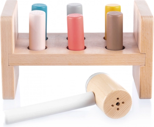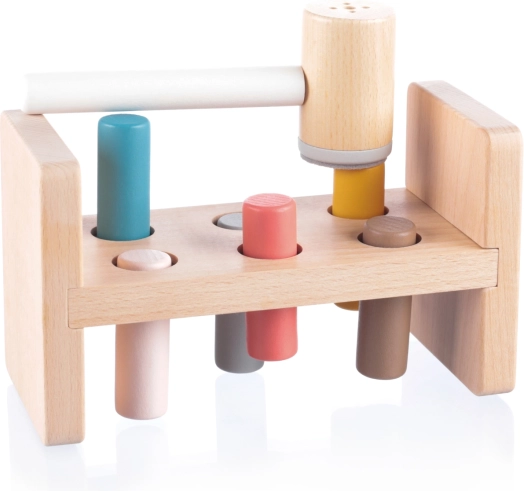 Dřevěná zatloukací hračka je navržena speciálně pro malé děti, které si s ní mohou hrát celé hodiny. Skládá se z dřevěného stolíku s otvory, šesti pestrobarevných kolíků a kladívka. Při zatlučení kolíku do otvoru kladívko vydává příjemný zvuk. Kolíky je možno zatloukat z obou stran stolíku, což přidává na zábavnosti.