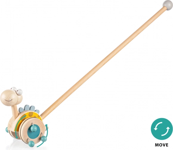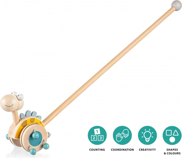 Jezdík na dlouhé tyči je perfektní hračka pro děti, které začínají chodit. Dinosaurus na tyči se při pohybu otáčí a díky dřevěným korálkům na kolečkách vydává zvuk, který dítě zaujme a povzbudí k chůzi.