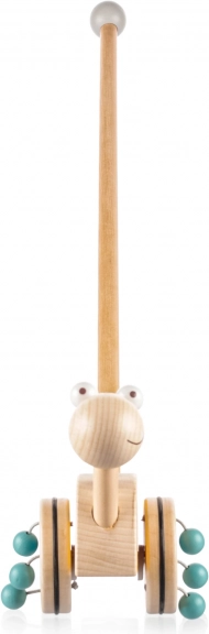 Pevná tyč poskytuje oporu při prvních krůčcích, s dřevěnou koulí na konci pro větší bezpečnost. Jezdík je vyroben z odolného dřeva bez ostrých hran, což zaručuje dlouhou životnost a bezpečné hraní.