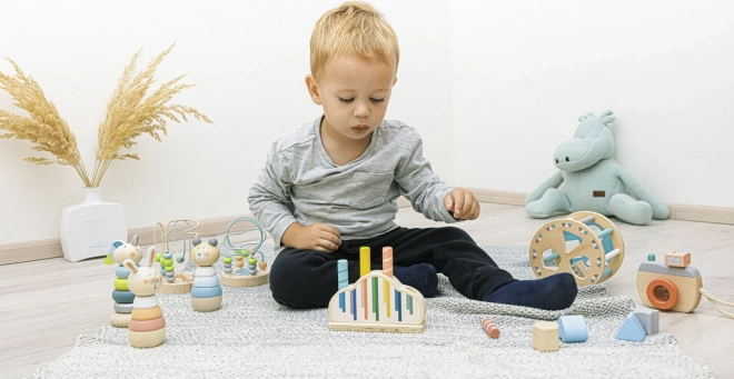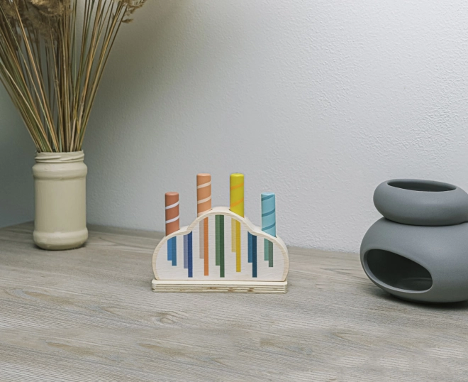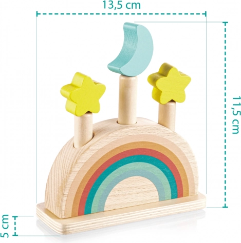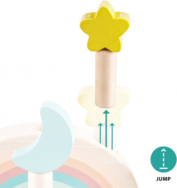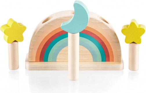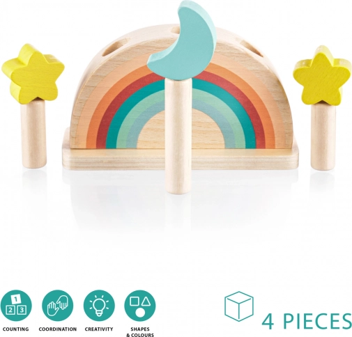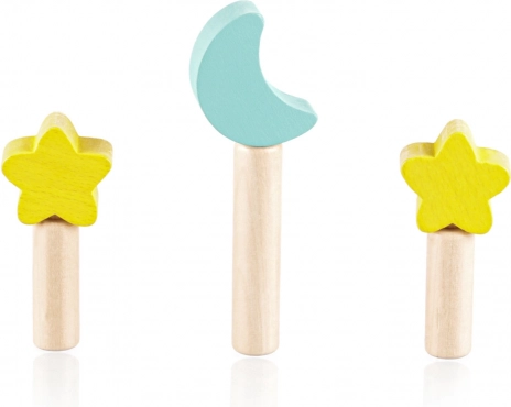 Zabavte své dítě na dlouhé hodiny s touto interaktivní dřevěnou hračkou. Je ideální pro zvídavé děti, které se zajímají o objevování nových věcí a učení se prostřednictvím hry. Tři barevné kolíky s designem měsíce a hvězd pevně drží dřevěný podstavec s pružinami. Jemným stisknutím se kolíky uvolní a vyskočí, což je nejen fascinující pro dítě, ale také rozvíjející jeho motoriku.