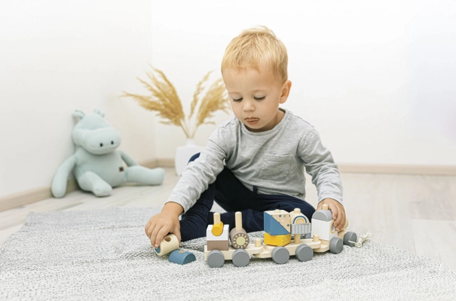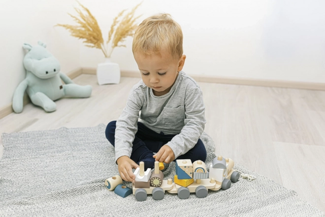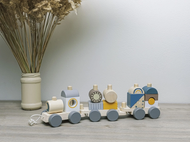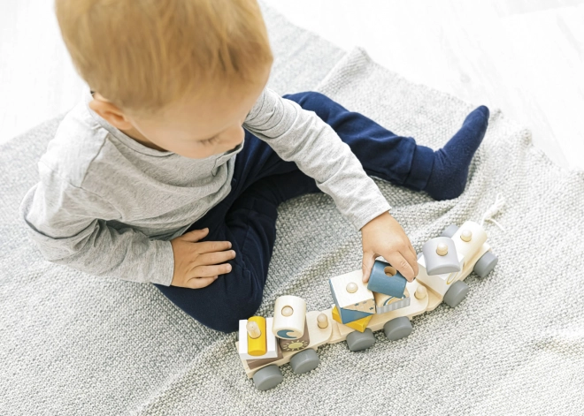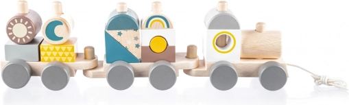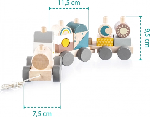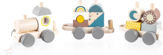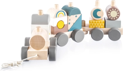 Barevný dřevěný vláček pro děti, který podporuje jejich motorické dovednosti. Tento interaktivní a vzdělávací vláček umožňuje sestavování a tahání, což motivuje děti k chůzi a rozvíjí jejich kreativitu.