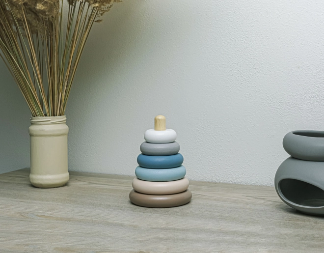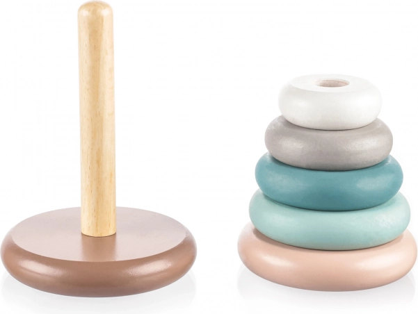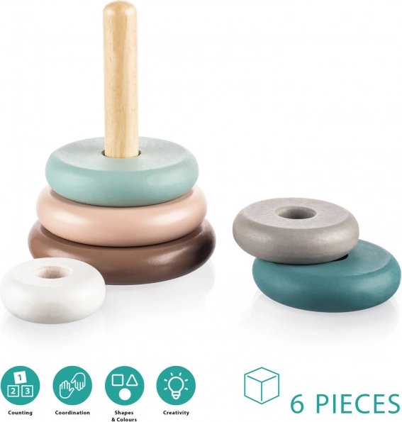 Dřevěné nasazovací kroužky přinášejí nekonečné možnosti zábavy pro malé objevitele. S touto sadou, která obsahuje 6 různě velikých kousků, je možné skládat a přetvářet mnoho různých kombinací. Hračka podporuje dovednosti jako třídění, skládání a rozeznávání barev a velikostí.