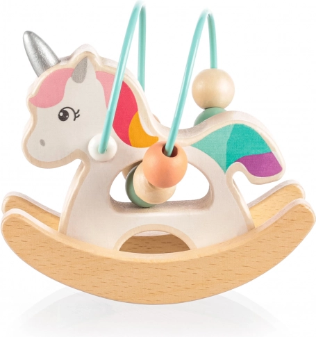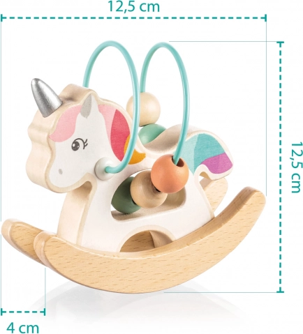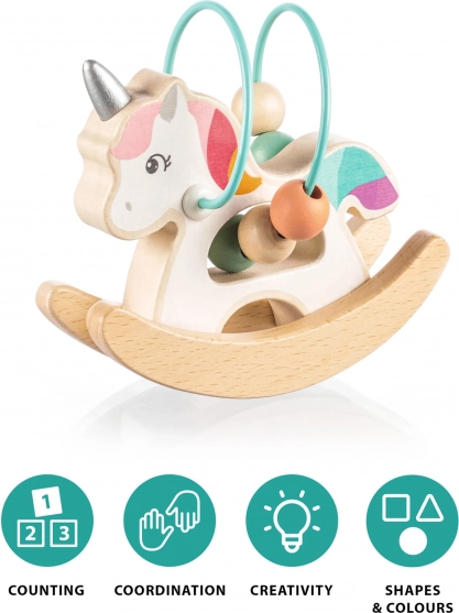Dřevěný aktivity jednorožec Mint spojuje oblíbený motiv jednorožce s chytrou interaktivní částí – korálkovým labyrintem. Děti mohou jednorožce „kolébat“ jako zvířátko a zároveň posouvat barevné korálky po kovovém vodiči, čímž si přirozeně trénují úchop, koordinaci oko–ruka a trpělivost.
