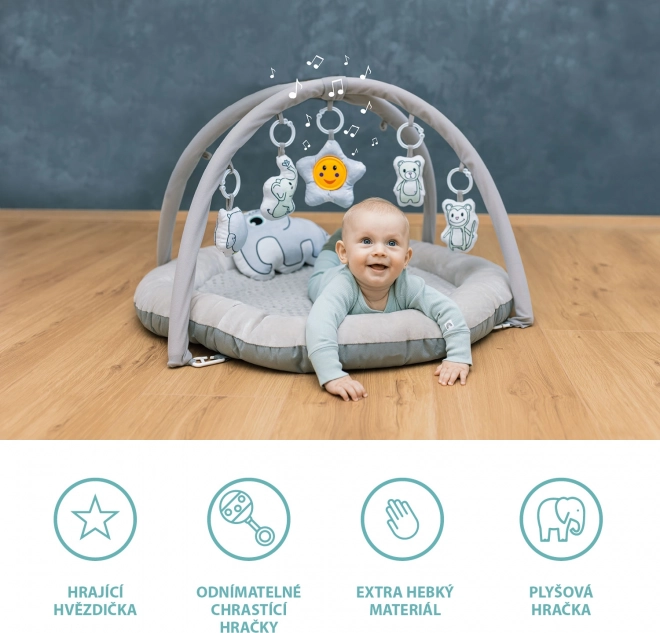 Tato stylová hrací deka Comfort Cuddle Grey je ideální první herní koutkem pro vaše miminko. Měkká a příjemná plocha poskytuje pohodlí při ležení na zádech i bříšku, zatímco zavěšené hračky na hrazdičkách motivují dítě k natahování a úchopu. Díky antialergennímu materiálu je deka šetrná k citlivé dětské pokožce.