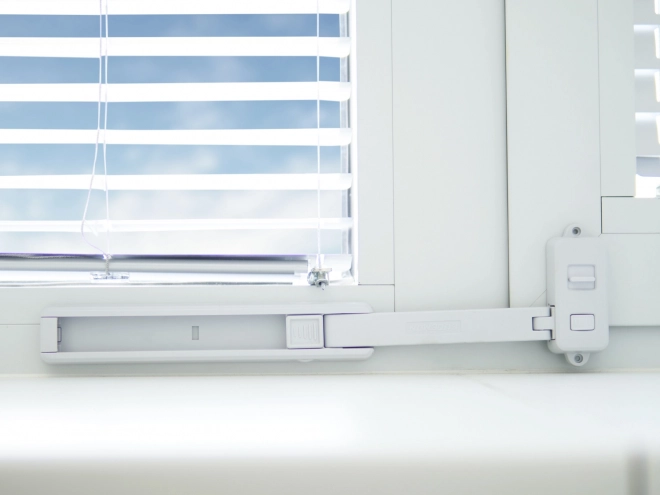 Spolehlivé zabezpečení oken a posuvných dveří díky našemu bílému zamykacímu mechanismu. Tento produkt je navržen tak, aby zamezil nechtěnému otevření a zabezpečil vaše děti před úrazy: