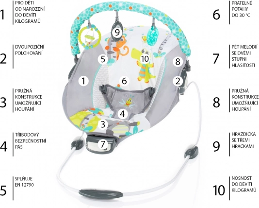 Bezpečí zajišťuje 3bodový bezpečnostní pás a protiskluzové nožky. Odnímatelná hrazdička se 3 omyvatelnými hračkami podporuje rozvoj jemné motoriky a zabaví při hraní. Praktický potah snadno sejmete a vyperete na 30 °C, takže je údržba rychlá a bez starostí.