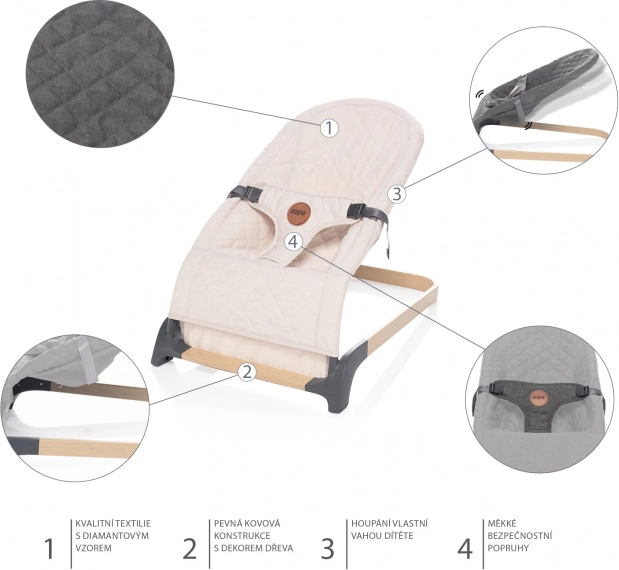 Textilie s diamantovým prošitím poskytuje pohodlí a stabilní oporu zad. Bezpečnostní popruhy udrží dítě v optimální poloze, zatímco robustní rám zajistí stabilitu při houpání. Údržba je snadná – snadno snímatelný potah vyperete na 30 °C.