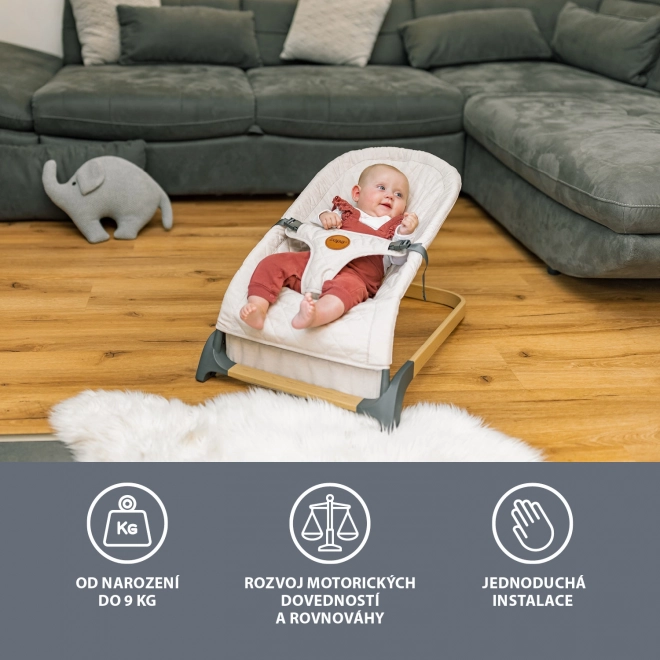 Konstrukce umožňuje jemné houpání na základě váhy dítěte, které podporuje rozvoj motoriky a rovnováhy a přináší přirozené zklidnění.