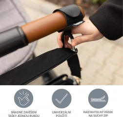 Užijte si pohodlné a organizované procházky s kočárkem. Multifunkční popruhy se skobou rozšiřují úložný prostor kočárku a umožňují připevnit kabelku, přebalovací tašku nebo nákupní tašky bezpečně a přehledně. Univerzální uchycení se suchým zipem sedí na většinu madel, včetně těch s koženým potahem.