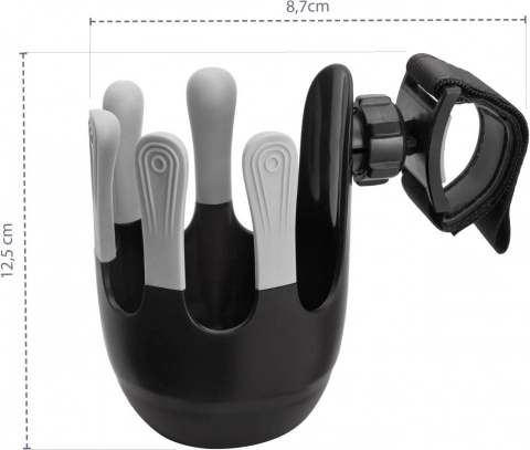 Unikátní pětiprstý design z pružného materiálu stabilizuje kelímek nebo lahev a minimalizuje riziko převrácení a vylití. Držák je odolný, lehký a snadno se čistí – ideální pro každodenní procházky i delší výlety.