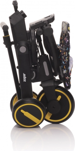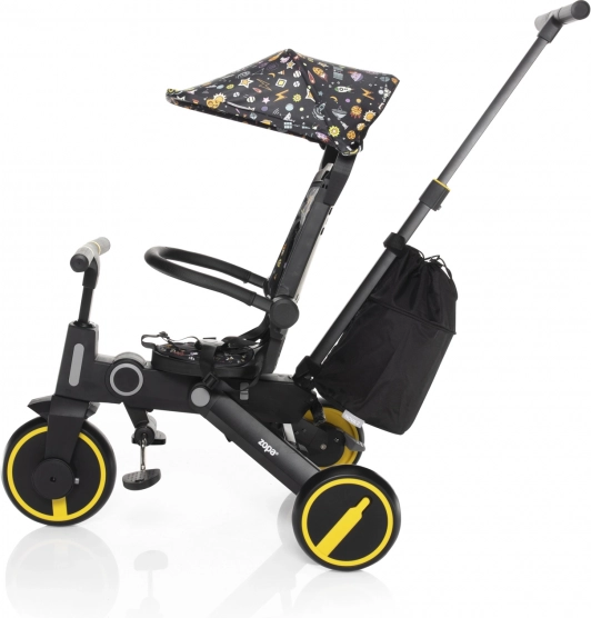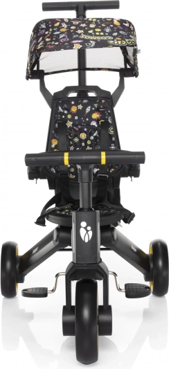 Pro bezpečné a komfortní vyjížďky je vybavena 5bodovým bezpečnostním pásem, polohovatelnou hrazdou, nášlapnou brzdou u zadních kol a odnímatelnou stříškou chránící před ostrým sluncem. Odnímatelná pedála slouží buď jako klasické šlapátko, nebo jako pohodlná opěrka nohou pro menší děti. Praktická odepínatelná taška a přenášecí vak usnadní cestování i skladování.