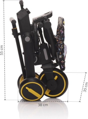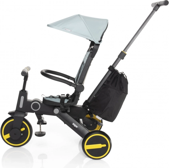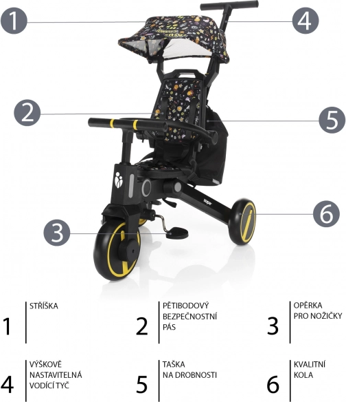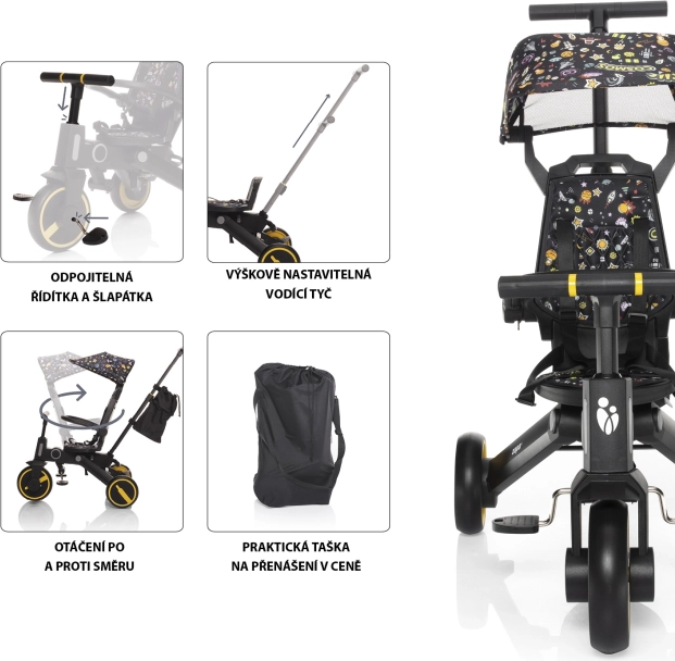 Rodiče mají plnou kontrolu pomocí vodicí tyče a nášlapné brzdy u zadních kol. Jakmile je dítě připravené, stačí odpojit pedály a řídítka, aby mohlo samo bezpečně trénovat rovnováhu i koordinaci. Nechybí odnímatelná stříška proti ostrému slunci a praktická odepínatelná taška včetně přenosné tašky pro snadné skladování a cestování.