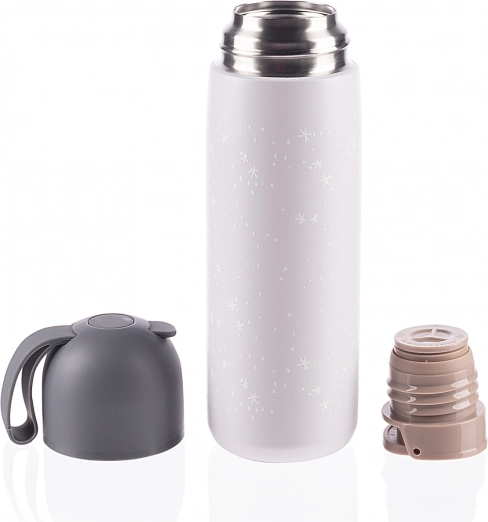 Praktické detaily oceníte na každém kroku: dvojitý uzávěr pro bezpečné a pohodlné nalévání, víčko použitelné jako hrníček a měkký silikonový držák pro jistý úchop. Protiskluzové dno drží láhev pevně na místě. Termoska je bez BPA a představuje eko-friendly alternativu k jednorázovým kelímkům a plastům.