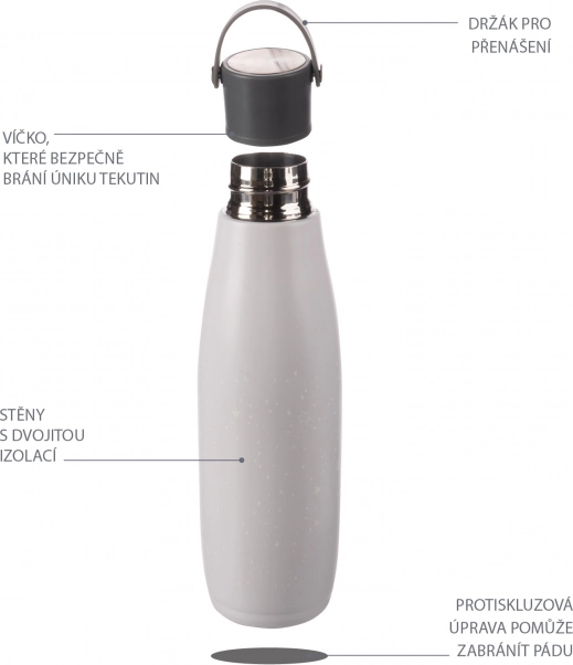 Praktický držák pro pohodlné uchopení usnadní přenášení na cestách, do práce i do školy. Těsné víčko zamezí nechtěnému úniku tekutin do tašky či batohu a protiskluzové dno zvyšuje stabilitu na hladkých površích. Termoska je navíc bez BPA a pomáhá omezovat spotřebu jednorázových plastů.