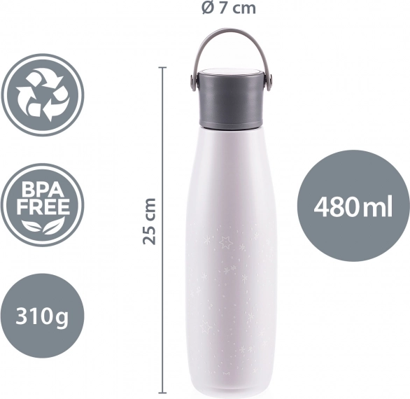 Termoska je vybavena těsným víčkem proti protékání a protiskluzovým dnem pro stabilitu. Je zdravotně nezávadná, bez BPA a šetrná k přírodě – opakovaným používáním snižujete spotřebu jednorázových plastů.