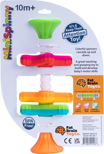MiniSpinny je chytrá smyslová hračka, která děti zaujme pohybem, barvami i dotykem. Tři kotoučky s různým počtem „nožiček“ se po spirálové tyči hladce protáčí a při sjíždění vytvářejí fascinující vizuální efekt. Texturované povrchy lákají k prozkoumávání a přirozeně rozvíjejí hmat a koordinaci.
