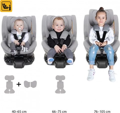 Konstrukce se dvouplášťovým korpusem a integrovanou boční ochranou účinně pohlcuje energii nárazu. Isofix ve spojení s opěrnou nohou zajišťuje pevné ukotvení, zatímco novorozenecká vložka, nastavitelná opěrka hlavy z měkké pěny a 4 polohy sklonu v obou směrech garantují pohodlí od miminka až po batole.