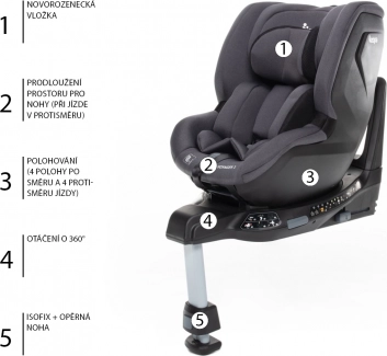 Plná otočka v rozsahu 360° usnadňuje každodenní manipulaci – dítě pohodlně připoutáte u dveří a jedním pohybem nastavíte směr jízdy. Čtyři polohy sklonu v obou směrech zvyšují komfort na krátkých i dlouhých cestách.