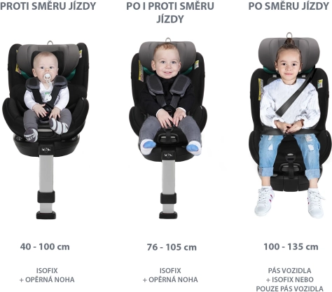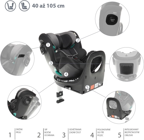 - Snadná obsluha: otočný mechanismus 360°, ISOFIX s opěrnou nohou, později možnost poutání 3bodovým pásem vozidla.