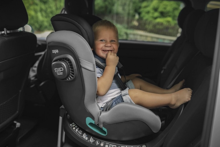 Jedním pohybem otočíte sedačku ke dveřím, dítě pohodlně připoutáte a zvolíte směr jízdy – proti směru až do 105 cm, od 76 cm i po směru.