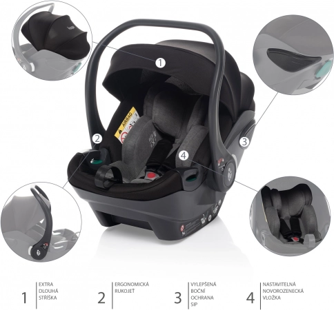 Pohodlí zajišťuje nastavitelná novorozenecká vložka a opěrka hlavy z paměťové pěny. Při nastavení výšky hlavové opěrky se automaticky přizpůsobí i pásy do správné polohy. Pro klidné cestování na slunci má sedačka extra dlouhou stříšku a praktická ergonomická rukojeť usnadní manipulaci.