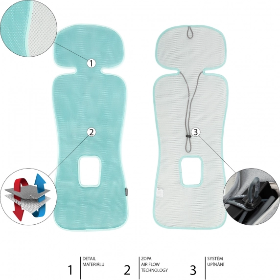 Podložka Zopa Breeze ve variantě Ice Grey je perfektní letní vložka pro autosedačky skupiny 1. Unikátní technologie Zopa Air Flow s 3D hexagon strukturou podporuje cirkulaci vzduchu mezi dítětem a sedadlem, čímž zvyšuje pohodlí i při delších cestách. Speciálně tvarovaná hlavová opěrka pomáhá omezit pocení i během spánku.