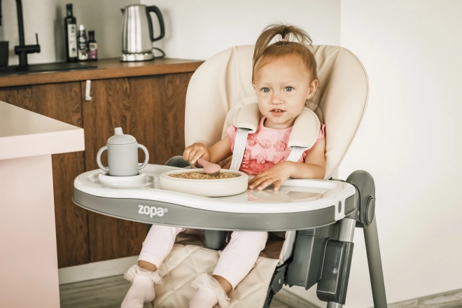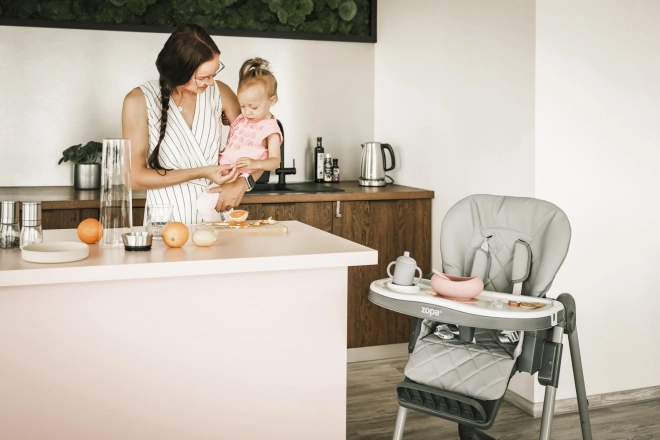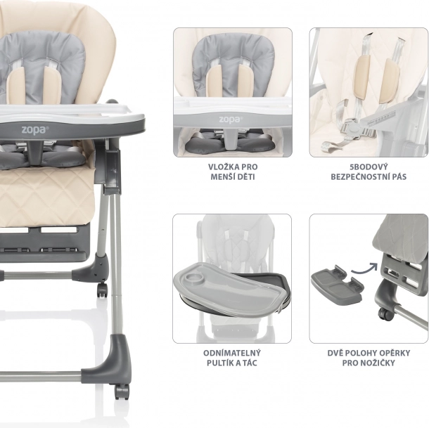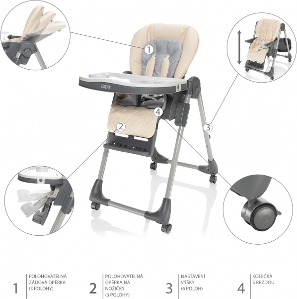 Zádová opěrka se dá nastavit až téměř do lehu a opěrka nohou nabízí 3 polohy. Dítě tak může po jídle pohodlně odpočívat i zdřímnout.