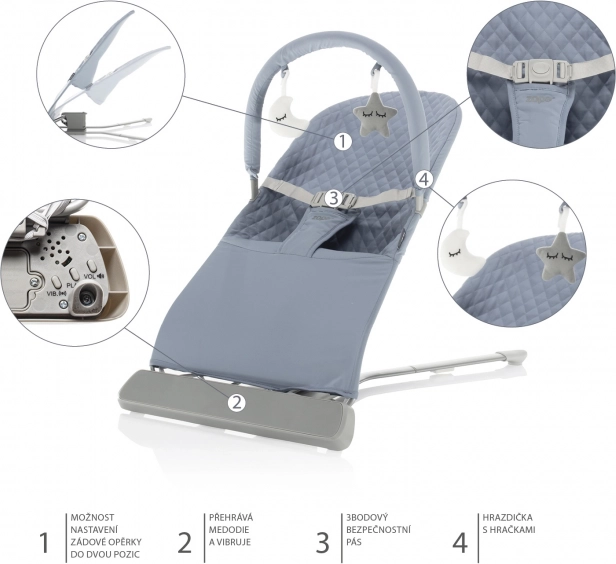 Lehačka Siesta je navržená pro pohodlný odpočinek novorozenců až do 9 kg. Kombinuje moderní vzhled s praktickými funkcemi: vibrace a melodie miminko uklidní, měkké polstrování zajistí komfort a 2 polohy zádové opěrky umožní přizpůsobit se aktuální potřebě dítěte.