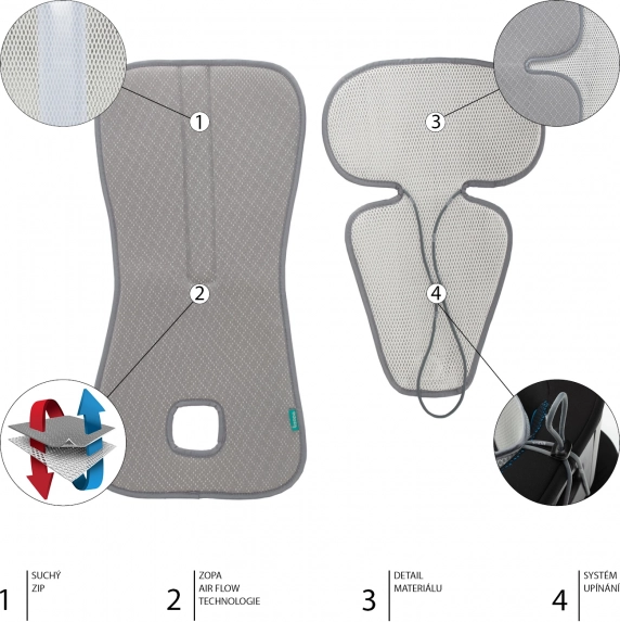 Podložka ZOPA Breeze pro skupinu 2/3 je vyvinuta ve spolupráci s rodiči tak, aby řešila nejčastější problémy letního cestování. Unikátní 3D struktura a technologie Air Flow umožňují proudění vzduchu mezi dítětem a sedačkou, takže se dítě méně potí a cítí se komfortně i na delších cestách.