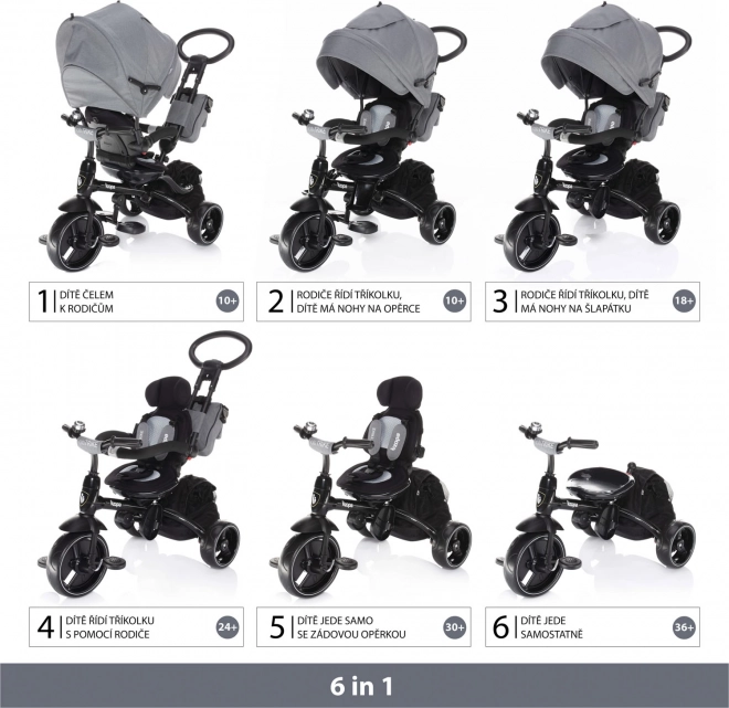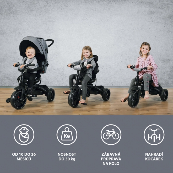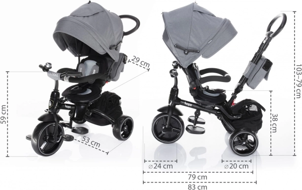 Možnost otočení sedátka do protisměru, odpojení šlapátek a postupná demontáž stříšky, hrazdy i opěrek umožní přizpůsobit tříkolku věku a dovednostem dítěte.