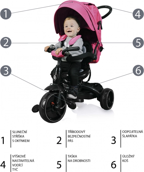 Bezpečnost zajišťují bezpečnostní pásy a praktické tlačítko pro blokování otáčení pedálů. Jak dítě roste, můžete postupně demontovat stříšku, hrazdu, přední opěrku, pedály i zadní opěrku a umožnit tak plnohodnotné řízení. Praktický košík a taška pojmou všechny nezbytnosti na procházku.