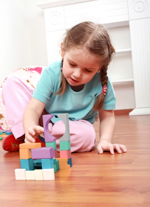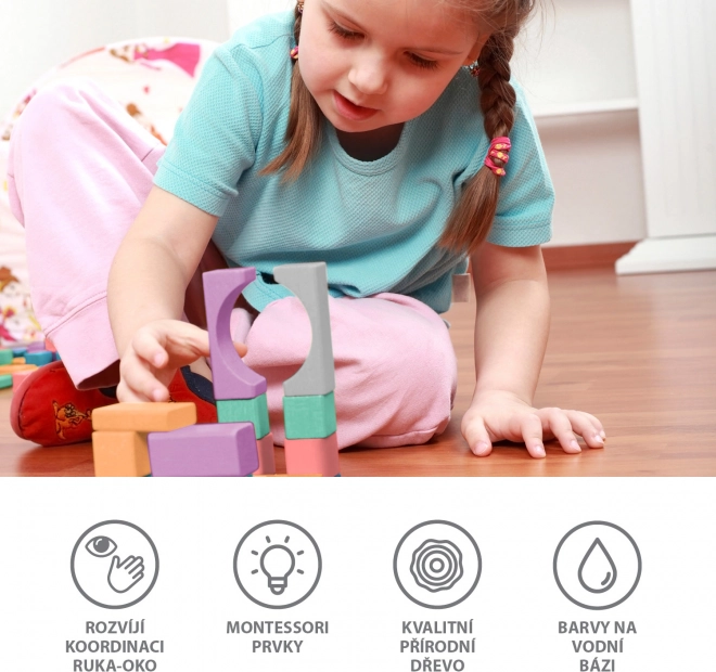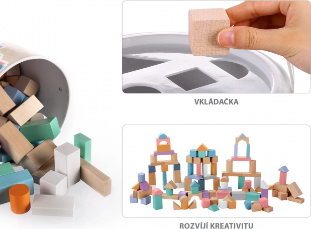 Kostky přicházejí v různých tvarech, včetně krychlí, válců a trojúhelníků, s pastelovými odstíny pro podporu kreativity.