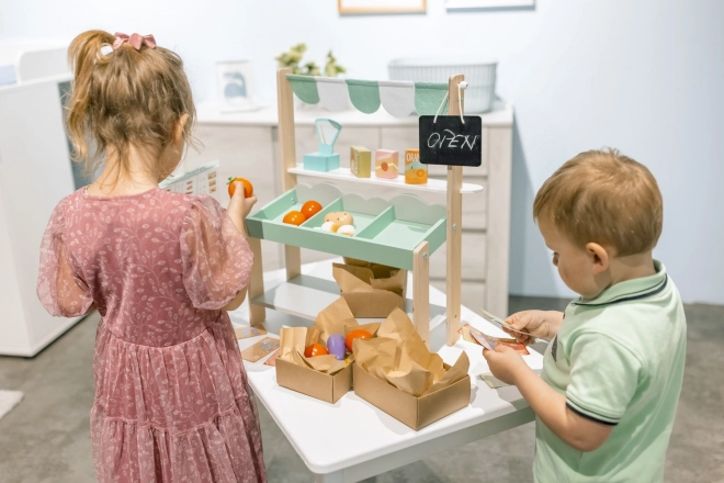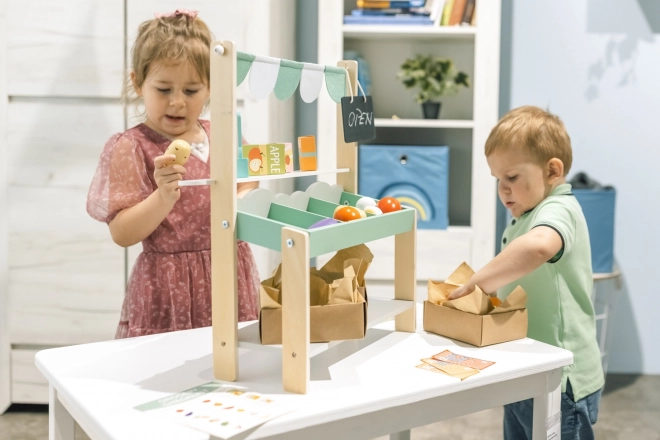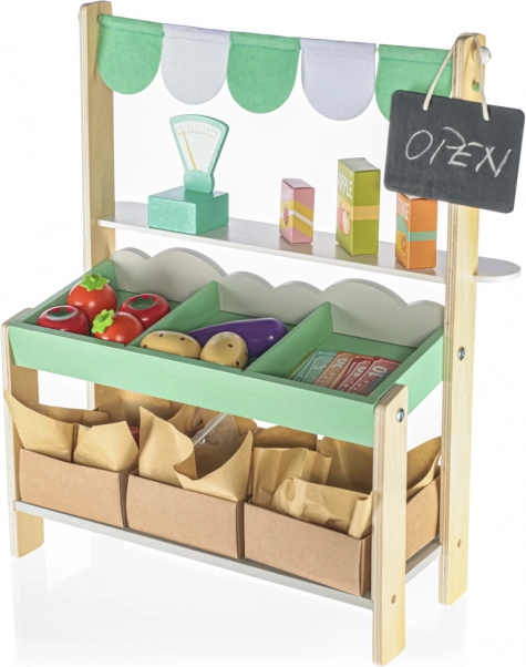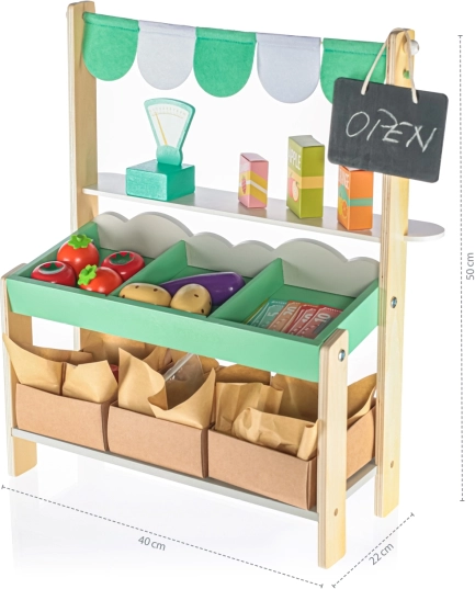 Dřevěný tržní stánek plný zábavy – navržen tak, aby inspiroval kreativu a role-play hry u dětí. Bezpečné a kvalitní dřevěné materiály zajišťují dlouhou životnost. Děti si užijí hodiny zábavy při uspořádání své vlastní tržnice nejen doma, ale i venku na terase.