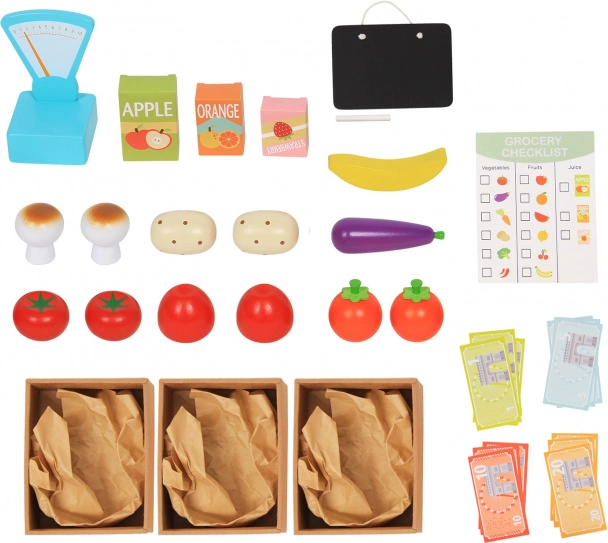 Balení zahrnuje vše, co je k prodeji na trhu potřeba – dřevěné ovoce a zelenina, váha a nákupní seznam.
