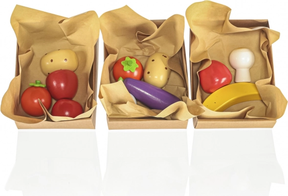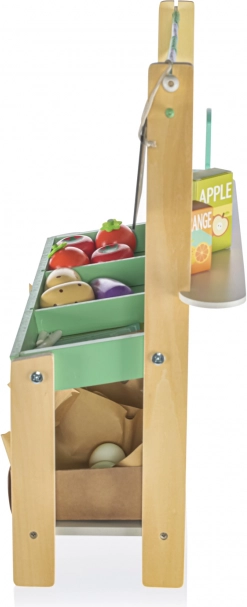Kompletní obchodní výbava – všechny potřebné doplňky jsou součástí balení. Naleznete zde dřevěné bedýnky, váhu, nákupní seznam a peníze. Děti mohou propuknout ve svou roli obchodníků a zákazníků a učit se, jak funguje tržní prostředí.