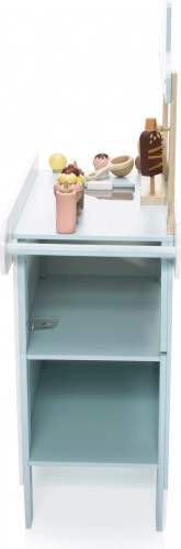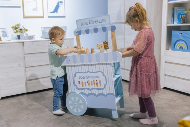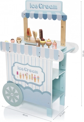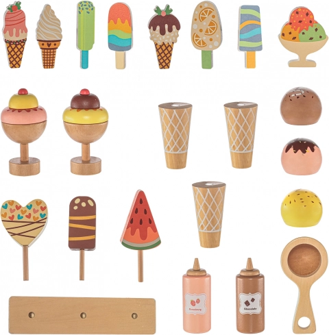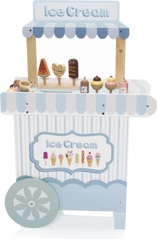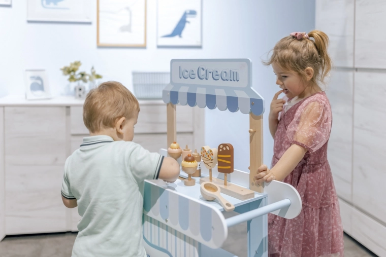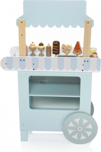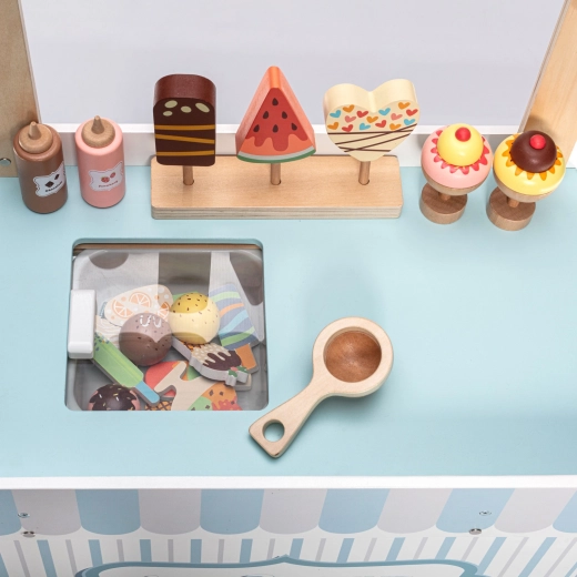 Dřevěný pojízdný zmrzlinový stánek je ideálním nástrojem pro rozvoj dětské představivosti a sociálních dovedností. Tento pečlivě navržený set je vybaven všemi potřebnými proprietami, včetně realistických zmrzlinových lahůdek a mrazničky pro udržení zmrzliny vždy čerstvé. Děti si mohou hrát na zmrzlináře a tvořit lahodné zmrzlinové pochoutky.