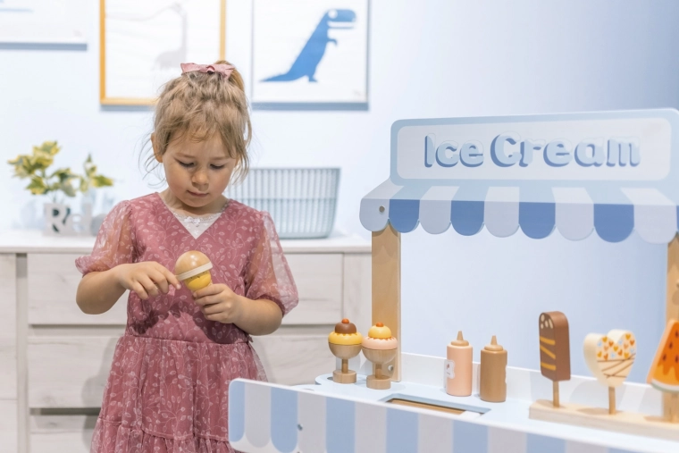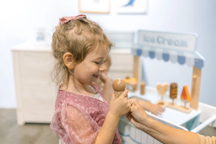 Děti mohou autenticky imitovat práci zmrzlináře s realistickými rekvizitami.
