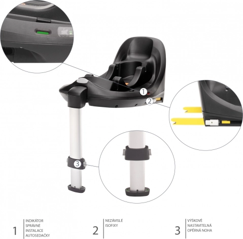- ISOFIX základna s opěrnou nohou a indikátory; možnost instalace pásy vozidla
