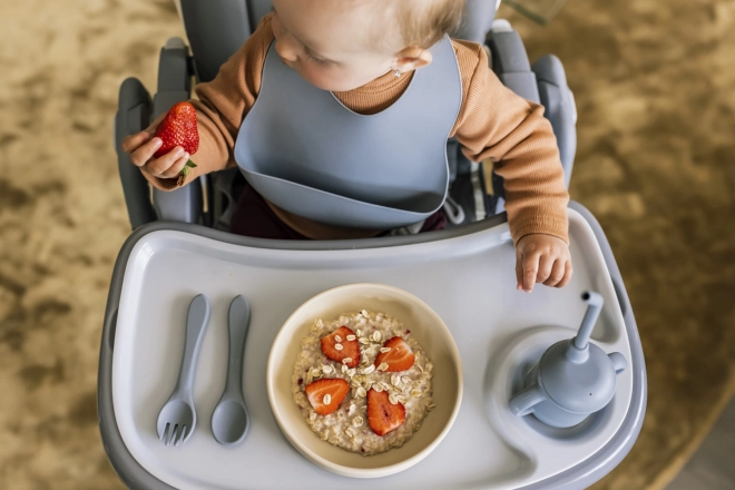 Praktická přední kapsa efektivně zachytí padající jídlo a drobky, takže stůl i oblečení zůstane čistší a krmení je bez zbytečného nepořádku.