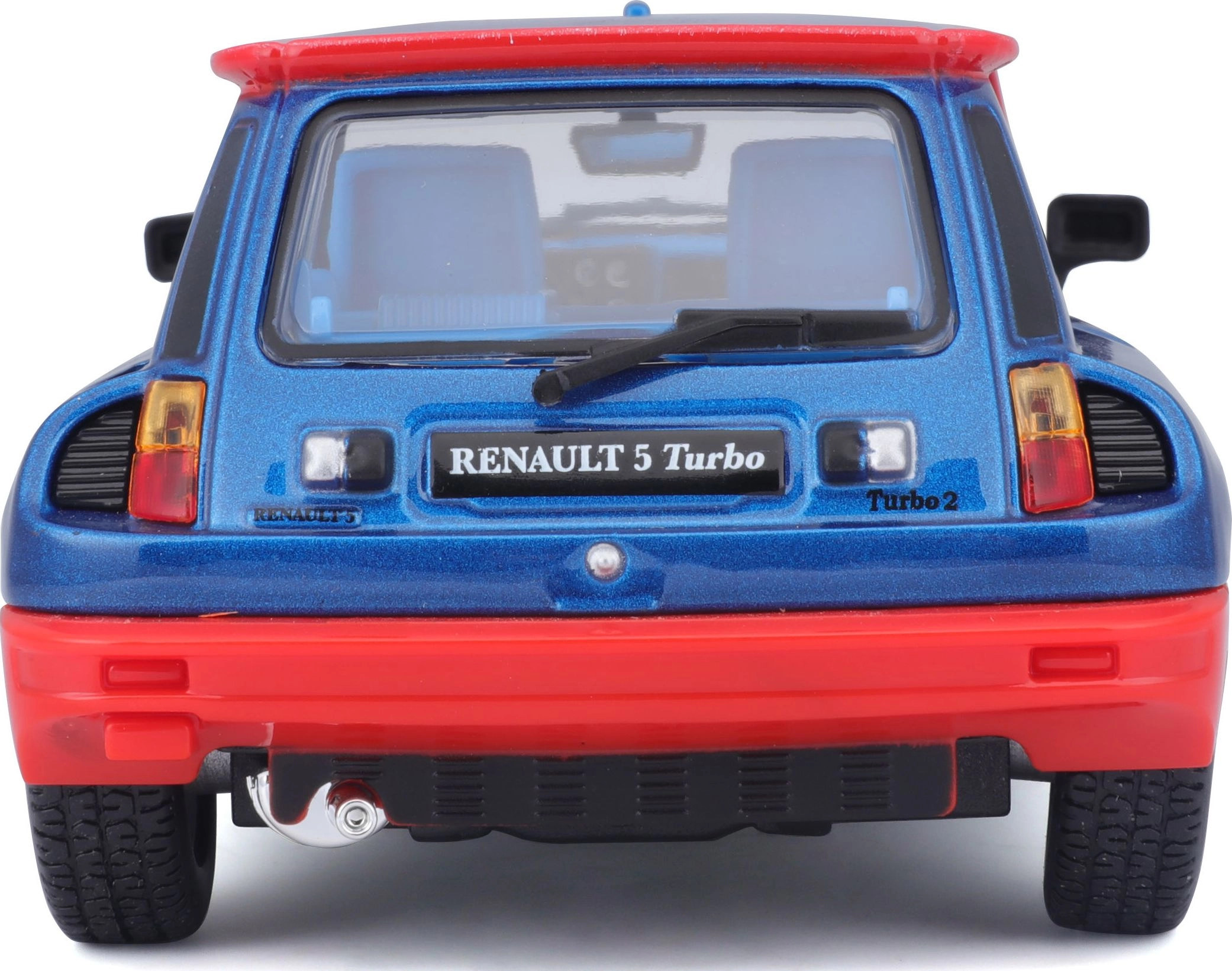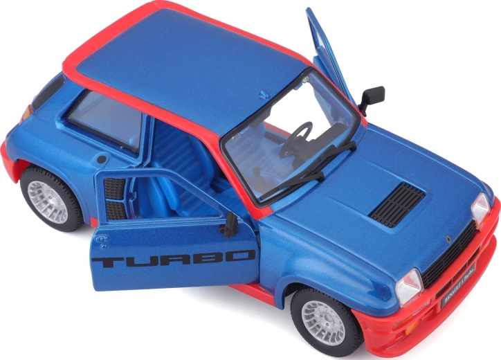 Model Bburago Renault 5 Turbo přináší věrnou repliku legendárního vozu s ikonickými širokými blatníky a sportovními prvky. V modré barvě s červenými akcenty a výrazným nápisem TURBO působí jako skutečný závodní speciál. Otevírací dveře odhalují realistický interiér se sedačkami a volantem.