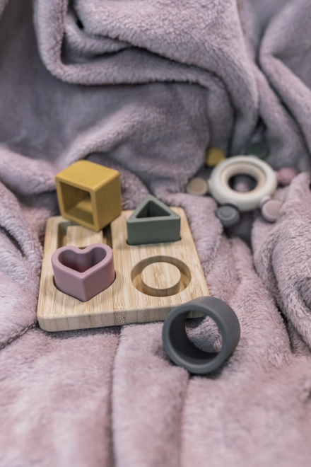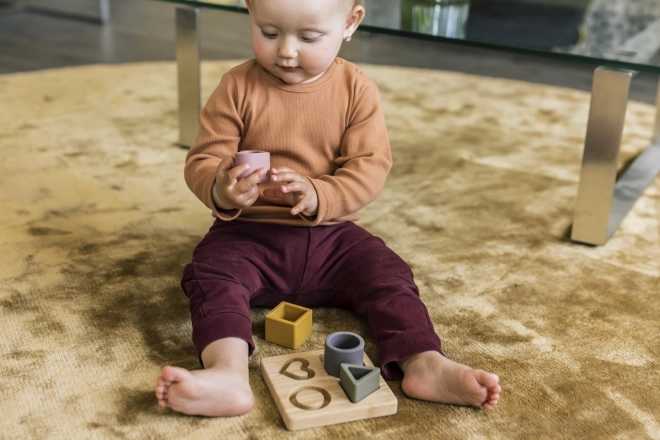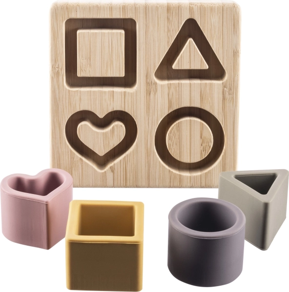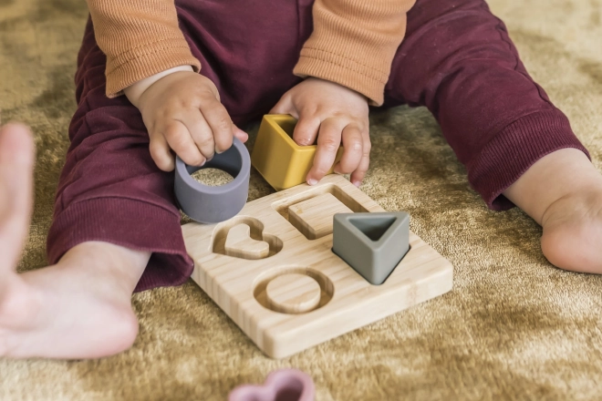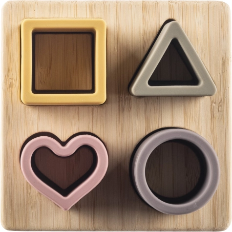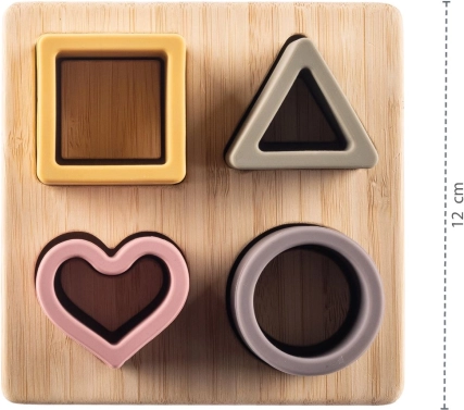 Objevte jednoduché a chytré puzzle s tvary čtverce, trojúhelníku, kolečka a srdíčka. Dřevěná základna a měkké silikonové dílky v pastelových barvách lákají k opakovanému zkoušení, třídění i vkládání. Díky bezpečnému materiálu jsou dílky příjemné i při prořezávání zoubků.