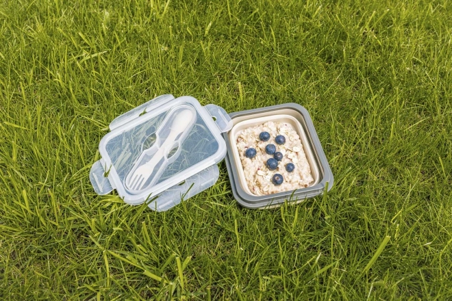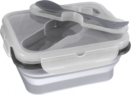 Praktický svačinový box ze 100 % potravinářského silikonu v barvě Dove Grey je skládací a ušetří až 60 % místa. Má těsnící víčko se zabudovanou přihrádku na příbor a obsahuje spork (lžička + vidlička). Je odolný proti rozbití, neabsorbuje pachy, je bez BPA, PVC a ftalátů a můžete ho dát do myčky, mikrovlnky i ledničky.