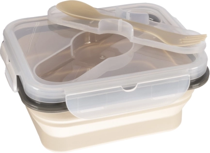 Praktický silikonový svačinový box v elegantní barvě sand beige šetří místo a udrží vaše jídlo bezpečně uzavřené. Díky skládací konstrukci ušetříte až 60 % prostoru, víčko spolehlivě těsní a v integrované přihrádce je uložen praktický příbor 2v1 (lžička/vidlička). Vyroben z 100% potravinářského silikonu, je netoxický, odolný proti rozbití a vhodný do myčky, mikrovlnky i ledničky.