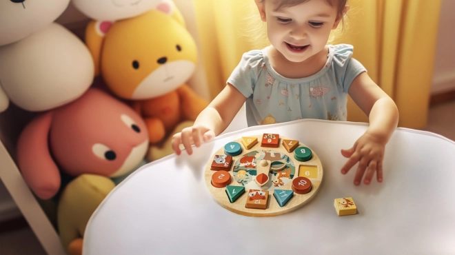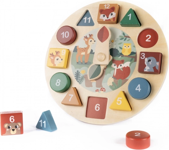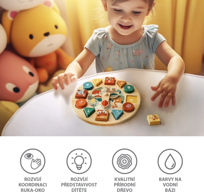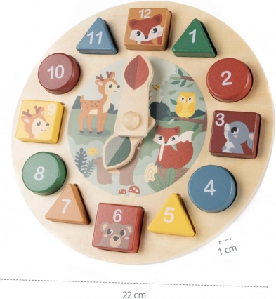 Objevujte svět času a tvarů s kvalitními dřevěnými hodinami o průměru 22 cm. Barevné vyjímatelné dílky s čísly v různých tvarech trénují rozpoznávání tvarů a barev, zatímco pohyblivé ručičky učí děti určovat hodiny i minuty. Pestrobarevné ilustrace zvířátek zaujmou na první pohled a motivují k dalšímu objevování.