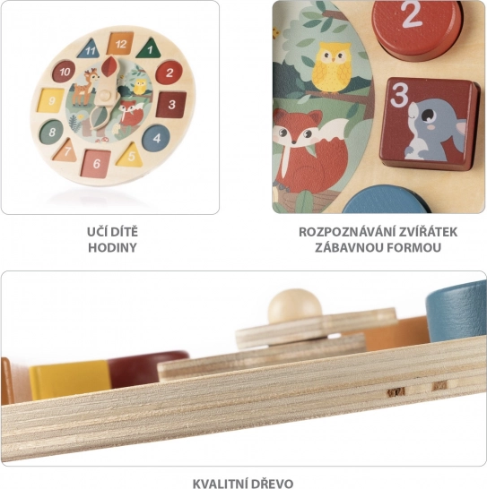- Komplexní učení: čísla 1–12, tvary, barvy, zvířátka a určování času.