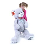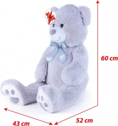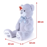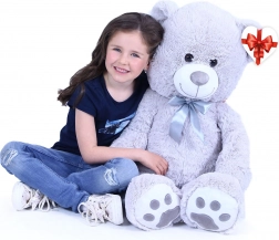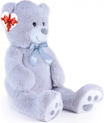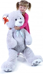 Velký šedý plyšový medvěd o délce cca 100 cm potěší svou měkkostí, přítulností a kvalitním zpracováním. Hebký povrch láká k mazlení, saténová mašle dodává elegantní vzhled a srdíčková visačka umožní přidat osobní vzkaz – ideální pro narozeniny, svátky i jako dekorace do dětského pokoje.