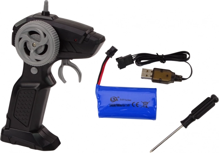 Pistolový ovladač 2,4 GHz pro stabilní signál do 30 m. V balení je akumulátor 3,7 V s USB nabíječkou – stačí dobít a vyrazit.