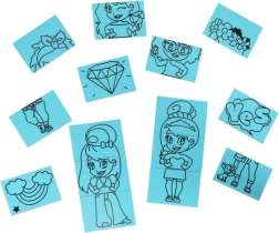 Stačí umístit bílý papír na modré kartičky, připevnit rám a obtáhnout kontury plochou tužkou. Pak přesunout papír na vzorované kartičky a přenést textury různobarevnými pastelkami. Vytvořte si květiny, skvrnky, tečky, cikcaky, které oživí každou plochu, od nebe po sukni.