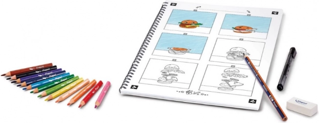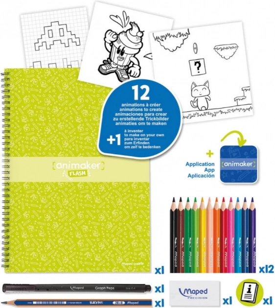 - Kroužkový sešit A4 se schématy animací (až 12+1 mini filmů), 12 pastelek Maped Strong Mini, černý liner Maped Graph’Peps, tužka Maped Navy, guma Maped, návod + QR kód k videu, přístup k bezplatné aplikaci Animaker